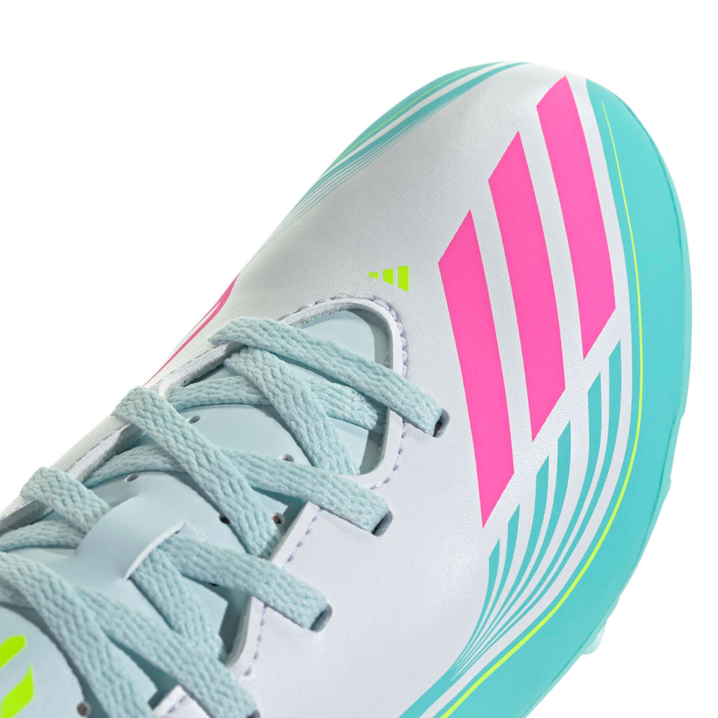 With a soft, lightweight, feel, these boots unlock game-changing speed on the pitch. The lightweight upper offers support and cushioning, while the synthetic floating tongue includes punch holes for breathability. The FG/MG tooling provides reliable traction on both natural grass pitches and artificial grass. With versatile grip and adjustable laces for a secure fit, young athletes can wear them with confidence. With iconic branding, including the Messi logo on the heel and F50 logo on the tongue, these boots are an authentic tribute to the legendary player.